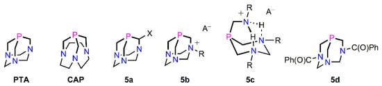 Both PTA and CAP display N-protonation characteristics that were be monitored by 31P{1H} NMR spectroscopy [77]. Our group found that cationic trialkylphosphines 5c are intramolecular H-bonded analogues of PTA and could function as effective ligands to Ru(II) and Rh(III) metal centres [91]. PTA was shown to undergo direct N-acylation with benzoic anhydride affording 5d in 38% yield and was shown to be soluble in both water and other polar solvents [92].