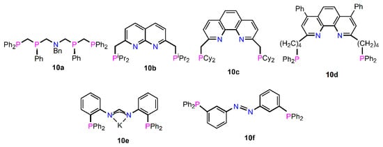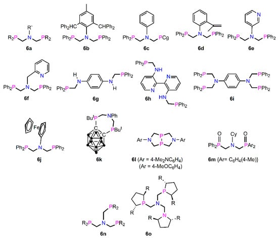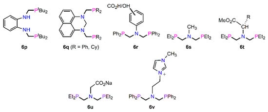 Previously, diphosphine 6g bearing two secondary amine groups, is capable of acting as a bridging ligand. In contrast, the groups of Yamashita [115] and Hill [116,117] have shown related 1,2-substituted bis(phosphino)amines 6p and 6q (Figure 9) are precursors to hydroborane and PCP pincer proligands. Hence, reaction of 1,2-phenylenediamine with tBu2PH and CH2O gave 6p in 68% yield, with both –NH– groups available for further reaction, in this case with BH3.SMe2 and nPr2NH to afford a hydroborane in this case. Whilst 6q was not isolated, it is clearly an intermediate which subsequently reacts with CH2O to form N,N`-bis(phosphinomethyl)-dihydroperimidines.