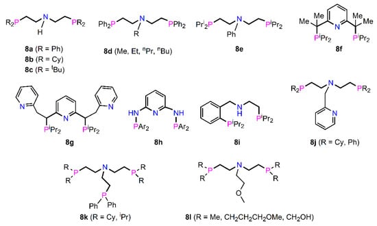 Deprotonation of the secondary amine can result in a facial PNP coordination in which there is an amido group. This can be appreciated in several examples (8n, 8o) of compounds shown in Figure 12 [156,157]. Dearomatisation is also important as a function of deprotonation and extensive studies have been undertaken in this field [135].