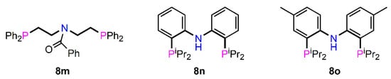 In a recent study in 2022 [154], the synthesis of a large family of N-amide functionalised PNP ligands 8m, including water-soluble variants [155], has been reported using an acyl chloride, NH2(CH2CH2PPh2)2+Cl− and NEt3 in CH2Cl2. The 31P{1H} NMR spectra show typically two singlets around −20 ppm, due to restricted amide bond rotation.