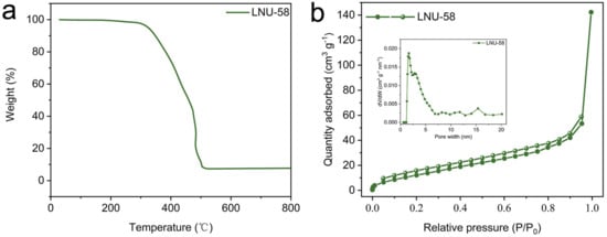 (a) TGA plot for LNU-58 under air atmosphere condition; (b) N2 adsorption–desorption isotherm of LNU-58 at 77 K, pore size distribution of LNU-58 (insert).