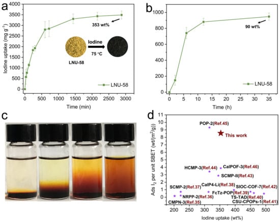 The adsorption performance of LNU-58 on both gaseous and dissolved iodine was further explored by calculating the weight of adsorbent solids before and after iodine adsorption by gravimetric analysis. The adsorption uptake of LNU-58 was close to linear at the initial stage (0–10 h) of adsorption and it achieved a saturation state with a sufficient contact time (50 h). As shown in Figure 4a inset, LNU-58 powder changed from yellow to dark brown and the maximum iodine uptake capacity of LNU-58 was up to 3533.11 mg g−1 (Figure 4a). Additionally, the LNU-58 sample was capable of trapping iodine from an aqueous solution with a high capacity of 903.6 mg g−1 in 12 h (Figure 4b).
