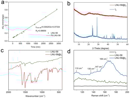 (a) Pseudo-second-order model plot for the iodine vapor uptake into LNU-58; (b) PXRD patterns of I2 and LNU-58@I2; (c) FT-IR spectra of LNU-58 and LNU-58@I2; (d) Raman spectra of I2, LNU-58, and LNU-58@I2.