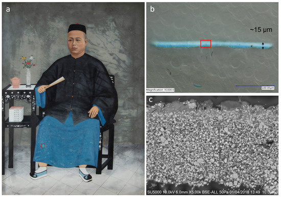 (a) Portrait of Mr Tan Beng Wan, Oil on canvas, Collection of The Peranakan Museum, National Heritage Board. Gift of Mr and Mrs Tan Choon Hoe. Red box denotes the location of the sample. Cross-section of the hazy sample in (b), reflected ring light microscopy with the red box denoting the scanning electron microscopy (SEM) image in (c).