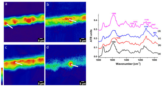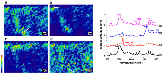 ATR–FTIR FPA imaging from the centre spot (70 × 70 µm2) and representative spectra: (a) amorphous zinc soap (1590 cm−1), (b) crystalline zinc soap (1540 cm−1), (c) gordaite (1120 cm−1), and (d) zinc lactate (1270 cm−1). Red denotes the highest intensity, and blue denotes the lowest intensity. For clarity of presentation, the experimental artefacts from the areas outside the sample were removed. ATR–FTIR spectra were taken from the spot with the highest intensity within the imaging representative for a selected wavenumber (marked by the white arrows).