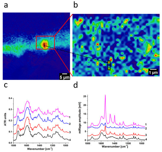 Comparison of the ATR–FTIR (FPA) and O-PTIR results: distribution of the integral calculated for 1270 cm−1 for zinc lactate collected for (a) ATR–FTIR and (b) O-PTIR. Red rectangle in (a) denotes the area in (b) analysed by O-PTIR spectroscopy. Four consecutive spectra are recorded from the points marked as (a) black line, (b) black rectangle. Distance between spectra is 1.1 µm for (c) ATR–FTIR and 0.5 µm for (d) O-PTIR.