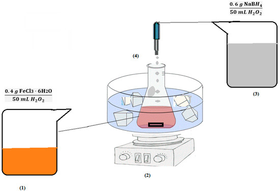 Zero-valent iron nanoparticles were synthesized according to Ibrahem et al.’s method as follows [23]: Iron nanoparticles were synthesized by mixing a ferric chloride (FeCl3) solution with a solution containing a reducing agent. The ferric chloride solution was prepared by dissolving 0.4 g of ferric chloride in 50 mL of deionized water. Then, in order to prepare the reducing agent solution, 0.6 g of sodium borohydride (NaBH4) was dissolved in 100 mL of deionized water. This solution (containing a reducing agent) was immersed in an ice bath before the ferric chloride solution was added dropwise with a flow rate of 0.13 mL/s using a microtube pump (Figure 1). It is worth mentioning that when no bubbles are produced for a long time, the reaction is considered complete. The final product was a black sludge, which was separated by a strong magnet. Then, the zero-valent iron nanoparticles were washed several times with distilled water and acetone to remove the residues and impurities. Finally, the synthesized nanoparticles were stored in a desiccator under nitrogen gas (oxygen-free conditions to prevent oxidation).
