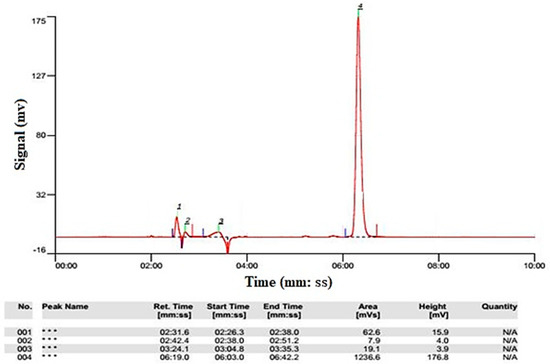 After the preparation of input and output samples of the reactor (centrifugation and passage through a 0.2 μm filter), the samples were injected into the HPLC device to determine the removal efficiency of amoxicillin. The amoxicillin antibiotic concentration was determined by HPLC (HPLC, Shimadzu, Kyoto, Japan, LC 10 A HPLC) equipped with a UV detector (SPD-10 AV) at 420 nm using a mobile phase with a volume percentage of 95:5 of potassium dihydrogen phosphate and methanol. The peak corresponding to the standard graph obtained from the HPLC device is shown in Figure 2. Equation (16) shows the removal efficiency of AMX: