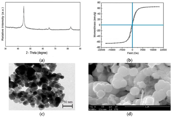 (a) XRD; (b) VSM; (c) TEM; (d) SEM analyses of the synthesized nanoparticles.