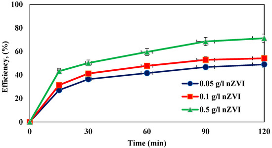 Investigation of the effect of different dosages of iron nanoparticles. The highest removal of AMX obtained was 72% using 0.5 g/L zero-valent iron nanoparticles. The increase in the adsorbent surface or its availability to antibiotic molecules, which was obtained by increasing the adsorbent dose, increases the removal percentage [30]. In Ali et al.’s study, the application of a green approach using pomegranate peel coated with zero-valent iron nanoparticles was used for the removal of amoxicillin. They reported that the removal efficiency increased with an increase in the adsorbent dosage (0.25–2.5 g/L) [31].The same results were obtained by Antoine Ghauch et al. for carbamazepine removal using the combined ultrasonic/Fe/H2O2 process [13]. Zhang et al. also found that the system’s efficiency increased with the increase in zero-valent iron nanoparticles [16].