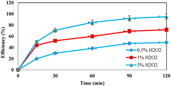 Hydrogen peroxide is a parameter that influences the Fenton process. In this study, the effect of hydrogen peroxide on the oxidation of the amoxicillin antibiotic was investigated. In order to achieve the best process efficiency, the contaminant was exposed to different concentrations of hydrogen peroxide (0.05, 1%, and 3%). As shown in Figure 5, the maximum removal efficiency of 95% was obtained at a concentration of 3% and after 120 min.