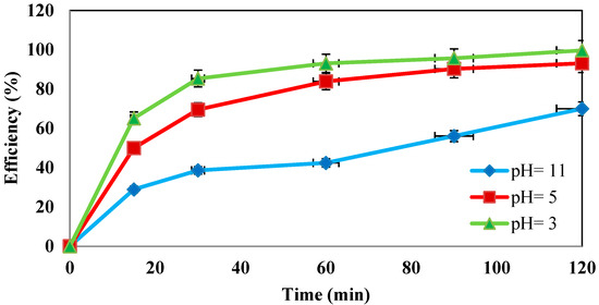 The effect of initial pH values of 3, 5, and 11 was investigated in the presence of 100 mg/L amoxicillin, 3% hydrogen peroxide, ultrasonic waves of 130 kHz, and 0.5 g/L iron nanoparticles. As shown in Figure 6, the efficiency of the nano-Fenton process decreased as the pH increased, so the maximum removal efficiency was observed at pH = 3.