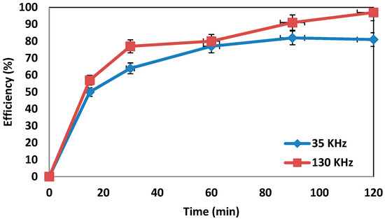 Determination of the effect of frequency changes on system performance. The system performance was examined at a frequency of 5 kHz, and the results showed that the removal rate of the system was 90% at a frequency of 35 kHz. The findings demonstrate that changing the frequency from 130 kHz to 35 kHz at constant power has no significant effect on system performance; however, in this case, the efficiency of the system was reduced. The obtained results are consistent with the findings of Manousaki et al. [36].
