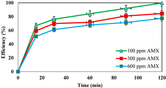 The effect of different concentrations of amoxicillin was also studied in the presence of nZVI = 0.5 g/L, H2O2 = 3%, pH = 3, and frequency = 130 kHz. The obtained results are shown in Figure 8.