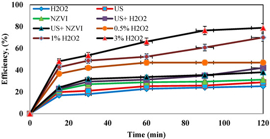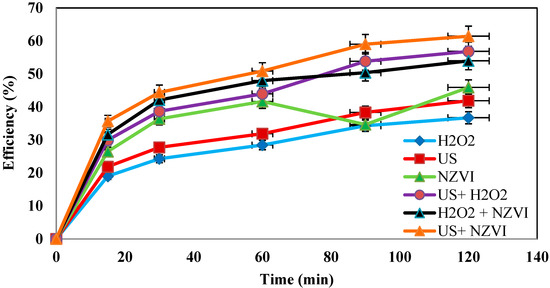 In this study, the efficiency of the US/H2O2/nZVI process was investigated. In order to study the effect of the combination of these processes on amoxicillin removal, the efficacy of each of these parameters was examined individually, and the results were compared with those of the combined process. The results are presented in Figure 9. As can be seen in all of the figures, these experiments were performed using US, nZVI, and H2O2 individually and the combination of each of them, and the results were compared with those of the combined method.