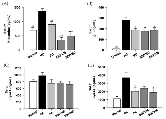 Representative proinflammatory mediators (i.e., histamine, IgE, and leukotriene) in serum and BALF were analyzed. Serum histamine and IgE were significantly increased in NC mice, which were reversed in PC and SBP mice, but there was no dose-dependent effect of SBP (Figure 3A,B). Leukotriene level was measured in serum and BALF. Leukotriene in BALF was dramatically increased by OVA/Alum. challenge, which was decreased in PC and SBP 300 mice (Figure 3D). There was a trend of increase in the serum leukotriene in NC mice (Figure 3C). Serum leukotriene level in PC and SBP mice was as low as Normal mice, but there was no statistical difference with NC mice (Figure 3C). It is well established that OVA/Alum. sensitization increases in the levels of inflammatory mediators, histamine, and IgE in serum and infiltration of inflammatory cells in lung tissues [25]. Additionally, additional OVA challenge enhances allergic reaction. Meanwhile, IgE molecules bind to mast cell receptors, thereby increasing release of the inflammatory mediators via mast cell degranulations [26,27]. The released IgE is responsible for increased production of leukotrienes, which in turn causes increased allergic responses via attracting eosinophils [28]. In our study, SBP suppressed the release of serum IgE and BALF leukotriene compared to NC mice, indicating SBP is beneficial to alleviate OVA/Alum.-induced allergic responses.