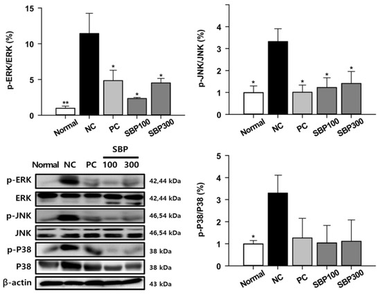Key inflammatory proteins were measured via Western blot analysis. MAPK signaling modules were divided into three groups: extracellular signal-regulated kinases (ERKs), P38 MAPKs, and c-Jun N-terminal kinases (JNKs), which play important roles in the expression and activation of inflammatory mediators in the airways [6,29]. Phosphorylation of ERK, JNK, and P38 was significantly increased in NC mice compared to the Normal mice, whereas phosphorylated ERK, JNK, and P38 in SBP mice were as low as PC mice (Figure 4). Activation of the intracellular MAPK signaling pathway underlies the inflammatory processes of asthma. For instance, ERK and JNK activation increases inflammatory cytokines including IL-5 and IL-13 [30]. In addition, p38 activation is accompanied by cytokine upregulation in macrophages of asthmatic patients [30]. Collectively, inhibition of the MAPK signaling pathway could be a therapeutic target for allergic asthma [30,31].