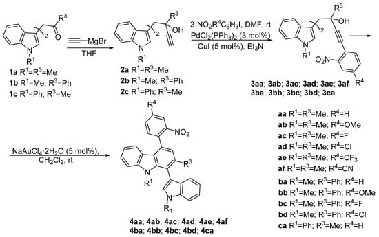 A selection of 1,1-bis(indol-3-yl)-3-alkyn-2-ols 3, was readily prepared through the alkylation of the indole derivatives 1 with methyl or phenyl glyoxal, followed by a standard Sonogashira-type reaction with 2-nitroaryl iodides. Next, these compounds underwent a cyclization reaction, promoted by NaAuCl4, affording the corresponding carbazoles 4 (see Scheme 1).