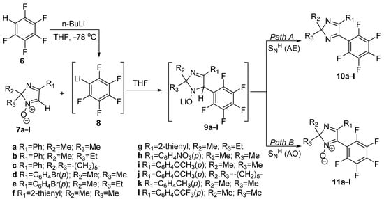 By combining 2H-imiazole 1-oxides 7a–l with pentafluorophenyl lithium 8 made in situ from pentafluorobenzene 6 and n-BuLi, Moseev et al. [] were able to create novel pentafluoroaryl-modified derivatives of 2H-imidazole type 10a–l and 11a–l, as is presented in Scheme 3. Pentafluorophenyllithium 8 first attacks the imidazole-N-oxide 7a–l, resulting in the unstable σH-adduct 9 that can be converted into the product either by “addition-elimination” (Path A), leading to the formation of compounds 10a–l, or by “addition–oxidation” (Path B), leading to the creation of compounds 11a–l containing N-oxide group.