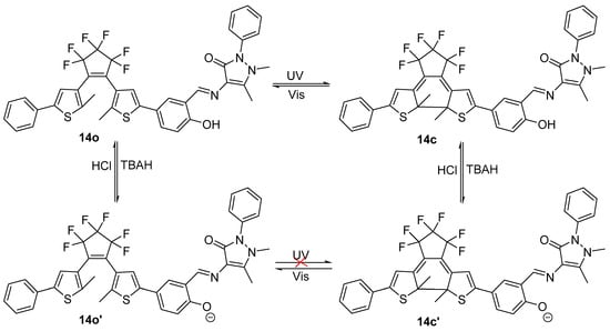 At 580 nm, the isomer 14o showed high brightly orange fluorescence. The emission strength of 14o reduced to 18% with the addition of 5.0 equiv of tetrabutylammonium hydroxide, and the color changed noticeably from bright orange to blackness as a result of the creation of deprotonated 14o’. The fluorescence could return to its initial form upon neutralization with 2.0 equiv of HCl. Similar to this, the stimulation of TBAH/HCl in acetonitrile could reversibly alter the fluorescence of 14c. When irradiated to UV/vis light, the fluorescence alterations between 14o’ and 14c’ was irreversible. The fluorescence of 14o’ stayed unaltered when irradiated to UV light, however when exposed to visible light (λ > 500 nm), the fluorescence of 14c’ might return to that of 14o’, as may be observed in Scheme 5. The results obtained by the authors shown that the base could suppress the photochromism of diarylethene with an antipyrine unit’s and acid could restore it.
