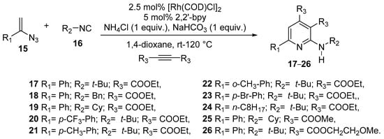 The reactions were carried “one-pot”, using vinyl azide 15 and isonitrile 16, Rh-catalyst, proper ligand and 1,4-dioxane as solvent, under N2 atmosphere and at room temperature in the first stage, then after the vinyl azide spot disappeared on TLC, NH4Cl, NaHCO3, and alkyne were added, and the mixture was heated to 120 °C for 8 h (see Scheme 6).