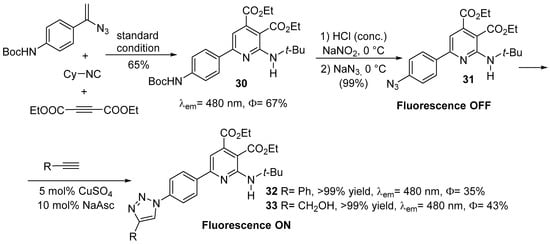The same authors [], in order to apply the newly synthesized compound as fluorescent probe, used the click reaction to bind the fluorescent aminopyridine scaffold to biomolecules conjugated with alkynyl group (see Scheme 8). Firstly, they synthesized a Boc-NH protected compound 30 accordingly to the above-described method from corresponding starting materials, then the azido substituted derivative 31 was obtained via a Sandmeyer reaction. Finally, the azide 31 react easily with phenylacetylene or propynol (by using catalytic amounts of Cu(II)) to obtain the desired triazole products 32 or 33.