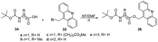 Piloto et al. [] studied the use of acridine azaheterocycle as a photochemically removable protecting group for the carboxylic group of amino acids involved in neurotransmision. In this respect, a series of amino acids 34 (glycine, alanine, glutamic acid, β-alanine and γ-aminobutyric acid) protected on amino group with tert-butoxycarbonyl, was treated with 9-bromomethylacridine 35, the corresponding heterocyclic ester 36 being obtained (see Scheme 9). The coupling reaction requires potassium fluoride as base and N,N-dimethylformamide as solvent, and take place at room temperature.