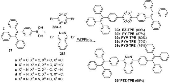 PY-TPE 39b, PYM-TPE 39c, PYA-TPE 39d, PYD-TPE 39e and PTZ-TPE 39f were easily synthesized by 4-(1,2,2-triphenylvinyl) phenyl boronic acid 37 reaction with 2,5-dibromopyridine 38b, 2,5-dibromopyrimidine 38c, 2,5-dibromopyrazine 38d, 3,6-dibromopyridazine 38e, 1,4-dibromophthalazine 38f under Suzuki cross-coupling in high yields (see Scheme 10). For comparison, an analogue molecule BZ-TPE 38a fused with phenyl unit was also prepared.