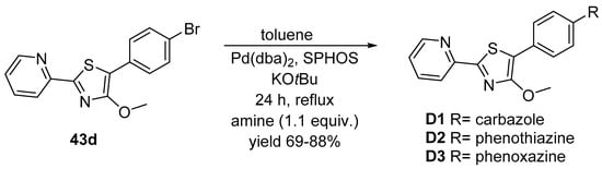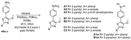The Buchwald–Hartwig reaction starting with 43d, a thiazole substituted aryl halide, was not successful under the conditions of the double N-arylation of the amines 44a–c, the biarylphosphane 2-(dicyclohexylphosphanyl)-2′,6′-dimethoxy-1,1′-biphenyl (SPHOS) was required as ligand (see Scheme 13).