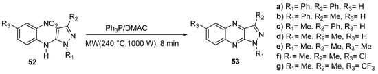 - Wojtasik, K.; Danel, A.; Wojtasik, M.; Lukasiewicz, M. Synthesis of 1H-Pyrazolo[3,4-b]quinoxaline Derivatives by Modification of the Regiospecific Reaction–the Influence of the Microwave Field. ChemistrySelect 2021, 6, 4330–4335. [Google Scholar] [CrossRef]