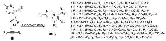 - Tatu, L.; Georgescu, E.; Boscornea, C.; Ungureanu, E.M. Synthesis and fluorescence of 1-[7-(4-nitrobenzoyl)-3-(biphenyl-4-yl)pyrrolo[1,2-c]pyrimidin-5-yl]ethanone. UPB Bull. Sci. 2015, 77, 49–58. [Google Scholar]