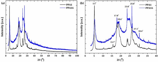Semicrystalline XRD patterns of the (a) as-synthesized PPA1 and PPA16 and (b) the angular region 2θ = 3–40° highlighting the most intense diffraction peak positions.