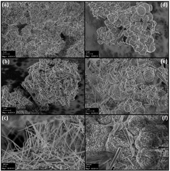Scanning Probe Microscopy (SPM) techniques such as Scanning Tunneling Microscopy (STM), Atomic Force Microscopy (AFM), and even profilometry are based on the three-dimensional images of surfaces that are suitable for the study of fractal properties. However, the images produced by SEM have also been widely used in fractal and multifractal analyses of surfaces [58], providing two-dimensional images without information on the height profile. In this case, the SEM image of a fractal surface is not self-similar in all spatial directions and presents the advantage of not introducing the tip convolution effect (usually causing a systematic error in the estimative of the fractal dimension) [59]. Figure 2 shows the SEM images of (a–c) PPA1HT and (d–f) PPA16HT-HH.