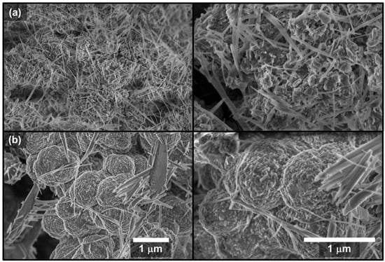 SEM micrographs of (a) PPA1HT and (b) PPA16HH-HH. Magnification of 25,000× and 50,000×, respectively.