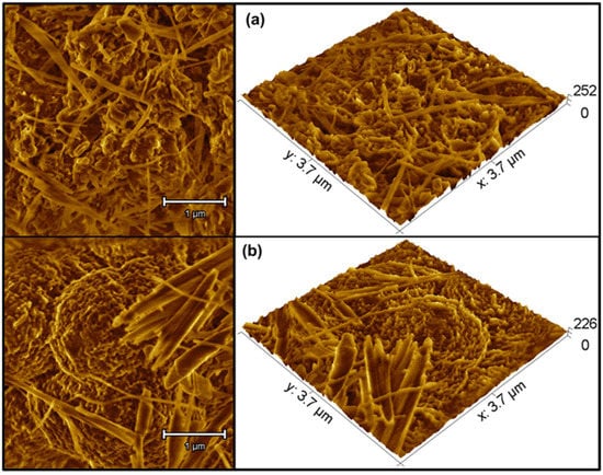 Systematic structural studies have been performed using the AFM technique to describe the statistical parameters used to evaluate the complexity of an individual surface [67,68]. This technique allows for the understanding of the influence of the material surface on specific properties. As a result, statistical parameters related to the particle surfaces such as roughness, peak distribution, height distribution, and nanotexture homogeneity have been determined. A previous report [67] presented advanced morphological and fractal aspects of a polymeric particle surface containing an encapsulated essential oil that were evaluated using AFM topographical images. The authors pointed to the influence of the essential oil concentration on the particles’ morphology and surface roughness. This tool can also be useful in evaluating the quality standard in the development of novel materials for the controlled release of bioactive compounds.