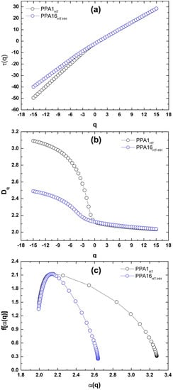 Figure 5c shows the shape and extent of the multifractal spectrum f(a) versus a, where the asymmetry of the distribution indicates the presence of multifractal. According to Table 2, in both PPA1HT and PPA16HT-HH, all the Df values were similarly positive and higher for PPA1HT. The singularity spectrum was wider for PPA1HT due to a greater surface heterogeneity and percentage of crystallinity (as previously observed in the XRD results). In addition, the spectrum was shifted to higher values and the multifractal spectrum of PPA1HT showed a greater inclination to the right when compared to that of PPA16HT-HH. Our results showed that the surface became more irregular and complex when the crystallinity was reduced. As a consequence, higher values for the multifractality parameter Δa (Δα = αmax − αmin) were observed while the Δf(a) values were reduced. It can be seen in Figure 5c and Table 2 that PPA1HT presented the greatest Δα width spectrum, pointing to the highest degree of multifractality.