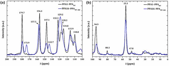 Figure 6 shows the non-normalized high-resolution solid-state 13C NMR spectra of PPA1 and PPA16. The 13C NMR spectra observed in a solid state, even when using magic-angle spinning (MAS), showed broader signals than the 13C NMR spectra recorded in solution due to the residual anisotropic effects (dipolar coupling) in response to the conformational changes, which regarded the differences in intramolecular interactions. The chemical shift signals between δ = (135–120) ppm observed in the PPA16 spectrum were more overlapped and less defined, suggesting a larger noncrystalline content. This result was previously observed in the XRD results.