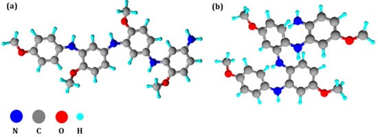 Solid-state polymerizations can generally be regarded as phase transitions from the crystalline phase of the monomer to the polymer growth phase. The character of these phase transitions determines the mechanism of the polymerization. It is therefore necessary to know the mechanism of the 3D order of the crystalline monomer transferred to the resulting polymer phase [43]. Our results suggested that the polymerization reaction started from both the nonbonding electrons of the amine groups and the oxygen atom. Thus, the bonds between these groups were not considered because the N–O, O–O, and N–N bonds were extremely unstable and photosensitive. The oxygen atoms did not find a more energetically stable situation for polymerization. What remained, in fact, was the bond between the amine groups and the carbon atoms in the ortho and meta positions. At this point, there were two possible considerations: (i) in the first situation (head-to-tail), the amine group was bonded at the meta-position of the amine from the neighboring residue through its nonbonding electrons. This polymerization pathway was considerably relevant because this carbon atom was the “most positive” of the aromatic ring; and (ii) as both carbon atoms (ortho and meta) were influenced by the amine and methoxy groups, the bond with other carbon atoms could also occur but to a lesser extent, resulting in a head-to-head molecular structure.