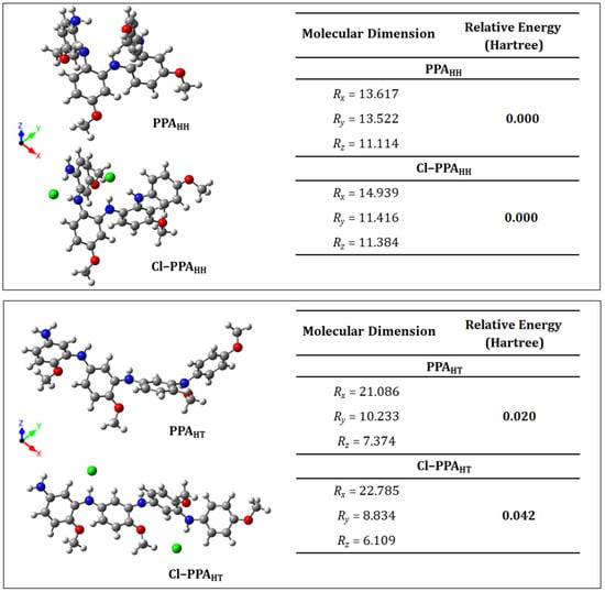 An optimization also was performed for the molecular structures of the chlorine-doped PPA. The Cl− counterion was incorporated into the molecular structures of PPAHT and PPAHH to obtain the doped polymers Cl–PPAHT and Cl–PPAHH, respectively. Figure 8 shows the PPAHT, Cl–PPAHT, PPAHH, and Cl–PPAHH tetramers and their respective molecular dimensions and energy values. The molecular structures of the doped tetramers presented different dimensions: the x-dimension increased, the y-axis was reduced, and the z-lattice presented a marginal modification.