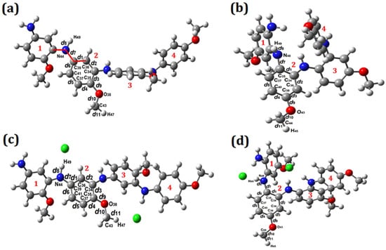 After evaluating the influence of the counterions on the molecular dimensions and energy values of the PPAHT, Cl–PPAHT, PPAHH, and Cl–PPAHH tetramers, a repeated unit from each polymer was structurally characterized as shown in Figure 9a–d with the interatomic distances labeled as dn ().