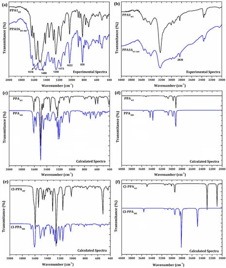 Since the 13C NMR spectroscopy results indicated the existence of head-to-tail (HT) and head-to-head (HH) polymerization for PPA, geometry optimizations were performed for both forms of the PPA polymer structures (henceforth labeled as PPAHT and PPAHH for HT and HH polymerization, respectively) using quantum-chemical density functional theory [36] as implemented in the Gaussian 03 program package (Wallingford, CT, USA) [37]. In particular, the gradient-corrected correlation functional of Perdew, Burke, and Ernzerhof (PBE) [38,39] in combination with the 6-311G(d,p) basis set was utilized for this purpose. However, previous studies also reported the use of hybrid functionals in the evaluation of conducting polymers [40,41]. Both PPAHT and PPAHH are tetramers formed out of covalent bonding of the four p-anisidine monomers in the conformation of the polymer chain. The doped forms of PPA were also considered (labeled as Cl–PPAHT and Cl–PPAHH) while taking into account the chlorine counterions in a half-oxidized PPA tetramer. Harmonic vibrational frequencies were determined for each optimized geometry at the same level of theory; positive frequencies were found for all vibrational modes in each optimized PPA to guarantee the obtention of a local minimum on the potential energy hypersurface. Preparation of the initial molecular structures and partial analysis of the calculated results were conducted with the aid of the Gaussview program [42].