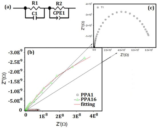 A Solartron 1260 impedance analyzer was used for collecting data at 27 °C by applying 500 mV from 10 Hz to 1 MHz. Polymers were pellets (1.3 cm in diameter and 0.14 cm in thickness) without thermal treatment and conductive ink exposure.