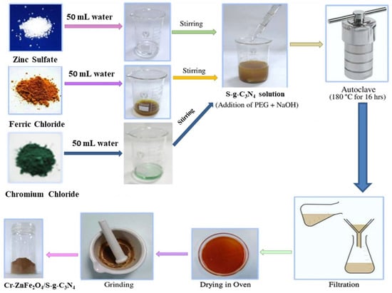 A range of ZFG-50 nanocomposites was made by incorporating 7% Cr-ZnFe2O4 with different concentrations of S-g-C3N4 (10, 30, 50, 60, and 70 wt. %) via surfactant-assisted hydrothermal process [30,31]. For the preparation of 7%Cr-ZnFe2O4/10%S-g-C3N4, four solutions A, B, C, and D were made before synthesis. Mixtures of 0.2346 g of CrCl3.6H2O in 30mL of water (Solution A), 2.6742 g of ZnSO4·7H2O in 30mL of water (Solution B), 3.244 g of FeCl3 in 30mL of water (Solution C), and 0.18 g of S-g-C3N4 in 30mL of water (Solution D) were dissolved in separate beakers and stirred. The solutions A, B, and C were added to solution D and homogenized for 45 minutes along with the addition of 10 mL of polyethylene glycol (PEG-400) as a surfactant. The next steps were the same as for the synthesis of Cr-ZnFe2O4 NPs. Moreover, the same process was repeated to synthesize the 7% ZFG-50 containing the (30, 50, 60, and 70 wt. %) of S-g-C3N4. The schematic diagram (Figure 1) depicts the synthesis procedure for ZFG-50 NCs, and Table 1 lists the precise composition.