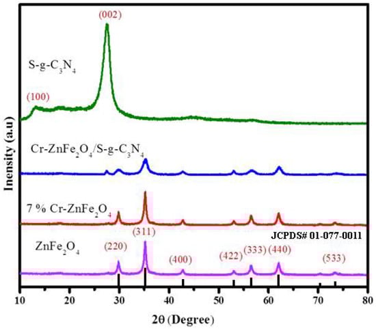XRD spectrum of composites of ZnFe2O4, S-g-C3N4, 7% Cr-ZnFe2O4, 7% Cr-ZnFe2O4/S-g-C3N4.