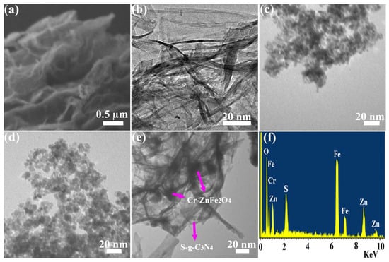 (a) SEM profile of S-g-C3N4, TEM profiles of (b) S-g-C3N4, (c) ZnFe2O4, (d) 7% Cr-ZnFe2O4, and (e) 7% Cr-ZnFe2O4/50S-g-C3N4 NCs. (f) EDX of 7% Cr-ZnFe2O4/50S-g-C3N4 NCs.