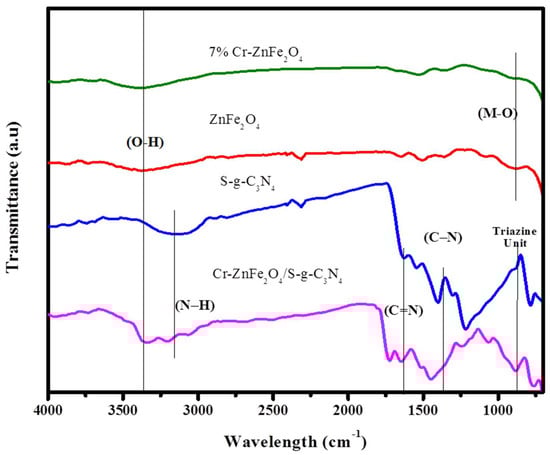 FTIR Spectrum of composites of ZnFe2O4, S-g-C3N4, 7% Cr-ZnFe2O4, 7% Cr-ZnFe2O4/S-g-C3N4.
