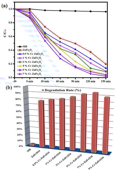 Under two phases, the photocatalytic activity of synthesized samples was investigated in the sunshine. The photocatalytic activities of ZnFe2O4 and Cr-ZnFe2O4 NPs (Figure 5a) were first investigated using an aqueous methylene blue solution in the presence of sunlight. A UV-vis spectrophotometer with a wavelength of 200–800 nm was used to track the dye degradation rate (Figure 5b). From the degradation contours (Figure S4) and % degradation plots (Figure 5b), the photocatalytic activity of chromium-doped zinc ferrite nanoparticles increased by increasing the Cr+3 doping up to 7 wt. %. Because the Cr+3 doping decreases the bandgap of ZnFe2O4, which facilitates the e−/h+ pair generation. 7% Cr+3 doping was the optimal concentration of Cr+3 ions. Increasing Cr+3 ions concentration beyond this (<7 wt. %.) leads to a decrease in photocatalytic activity of Cr-ZnFe2O4 NPs (Figure 6a,b). The observed degradation efficiencies of Cr-ZnFe2O4 catalysts with different chromium percentages (0, 0.5, 1, 3, 5, 7, and 9 wt. %) were 78%, 81%, 83%, 87%, 92%, 95%, and 89%, respectively, after 150 min of sunlight irradiation. Thus, the 7% Cr-ZnFe2O4 NPs exhibited the maximum photocatalytic efficiency as compared to other nanoparticles.