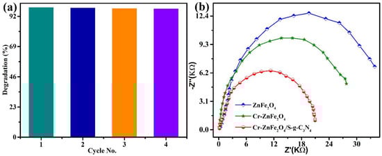 (a) Cyclic stability of the ZFG-50 NCs photocatalysts through the fourth cycle and (b) EIS Nyquist plots of ZnFe2O4, Cr-ZnFe2O4, and ZFG-50.