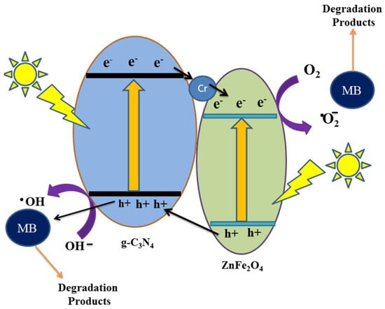 In the photocatalytic degradation mechanism as purposed in the schematic sketch (Figure 8), the enhanced degradation of methylene blue by photocatalysts may be ascribed due to the generation of e−/h+ pairs. EPR spectra of ZFG-50 NCs were explored to further corroborate the validation of functional species ·O2− and ·OH in the photodegradation mechanism (Figure S7a,b). When solar light is irradiated on ZFG, both Cr-ZnFe2O4 and S-g-C3N4 are energized and e−/h+ pairs are generated on their conduction band (CB) and valence band (VB), respectively [53]. Based on the CB/VB edge potentials, the photo-induced electrons can be easily migrated from the conduction band (CB) of Cr-ZnFe2O4 to the CB of S-g-C3N4 since the CB of Cr-ZnFe2O4 is lower than that of S-g-C3N4. At the same time, the holes generated in the VB of S-g-C3N4 could migrate to Cr-ZnFe2O4 [23]. The Cr atoms not only decrease the Eg value but also act as facilitators to transport e− from S-g-C3N4 to ZnFe2O4 in the hybrid composite. Thus, doping could considerably reduce the possibility of photogenerated charge recombination by improving the separation of photogenerated e−/h+ pairs. The generated e− & h+ reacts with the water and oxygen molecules absorbed on the surface of the photocatalyst and produce radicals (·OH and ·O−2) [8]. These radicals are utilized to break down MB by transforming it into low molecular weight intermediates, which are then changed into H2O, CO2, and inorganic ions via an oxidative mechanism. Equations (1)–(7) show the reductive and oxidative reactions involved in the photo-degradation of MB by ZFG NC.