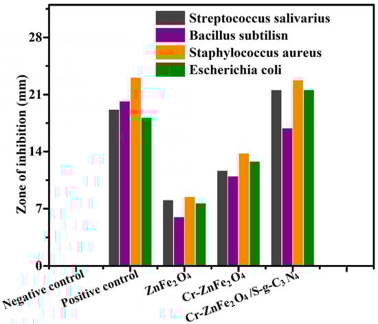 Both Gram-positive and Gram-negative bacteria were used to examine the antibacterial properties of ZnFe2O4, Cr-ZnFe2O4, and ZFG-50 NCs. Using the standard agar diffusion techniques, the antibacterial activity was carried out. Staphylococcus aureus, Bacillus subtilis, Escherichia coli, and Streptococcus salivarius were the four different bacterial strains used in the antibacterial tests. The Petri plates were taken out after the incubation period and placed under a laminar flow hood. Measurements and records of the zones of inhibition are provided in Table 4 for each sample, including the positive and negative controls. The zones of inhibition for each of the four bacterial strains against each of the four nanomaterials were measured and reported using the same method.